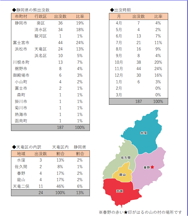 そのうち、はるの山の村のある天竜区では24件(全体の13%)、春野町では4件(全体の2%)です。※天竜区は非常に大きく、春野町は掛川市と同じくらいです